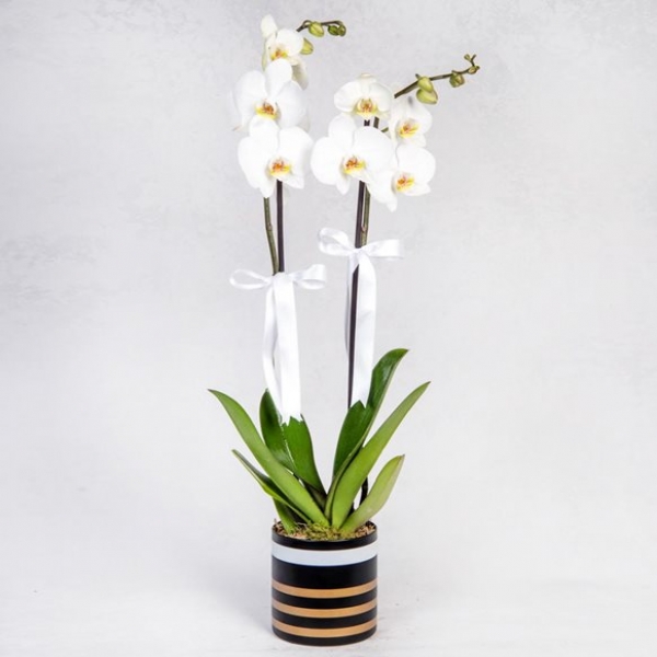 2 Dallı Beyaz Orkide Alt Cam Çizgili Vazo