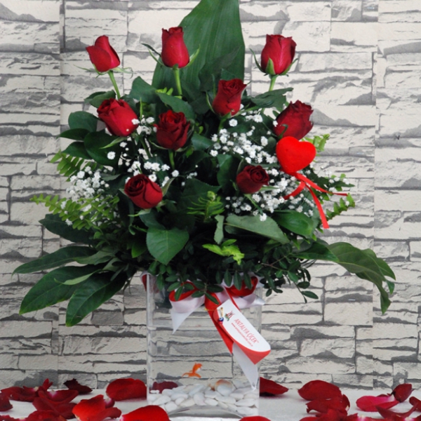 Ürün Kodu: LC69Mika Vazo İçerisinde Balıklı Ve 9 Adet Kırmızı Gülden Oluşan Sevgilye Hediye Edilebilecek Zarif Bir Çiçek Aranjmanıdır.