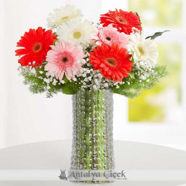 Ürün Kodu: LC78Cam vazoda 7 adet renkli gerberalardan oluşan şık ve bahar renkli aranjman.