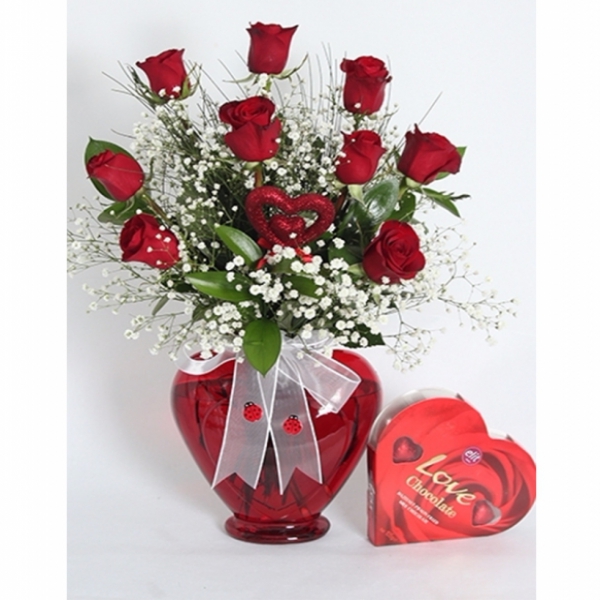 Ürün Kodu: LC479 Adet Kırmızı Gül Cipso ve Yeşillikler Çubuk Kalp Love Çikolata Kırmızı Cam Kalp Vazo