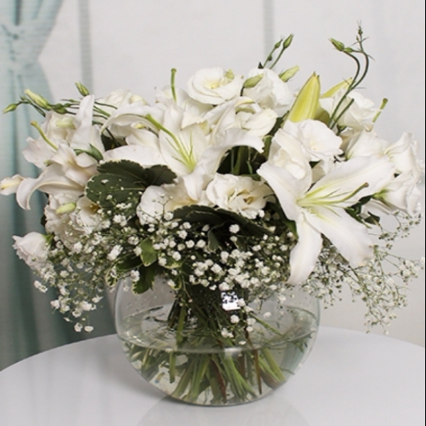 Ürün Kodu: LC54Beyaz Lisyantuslar,Beyaz Kazablankalar,Cipso ve Yeşillikler,Cam Fanus